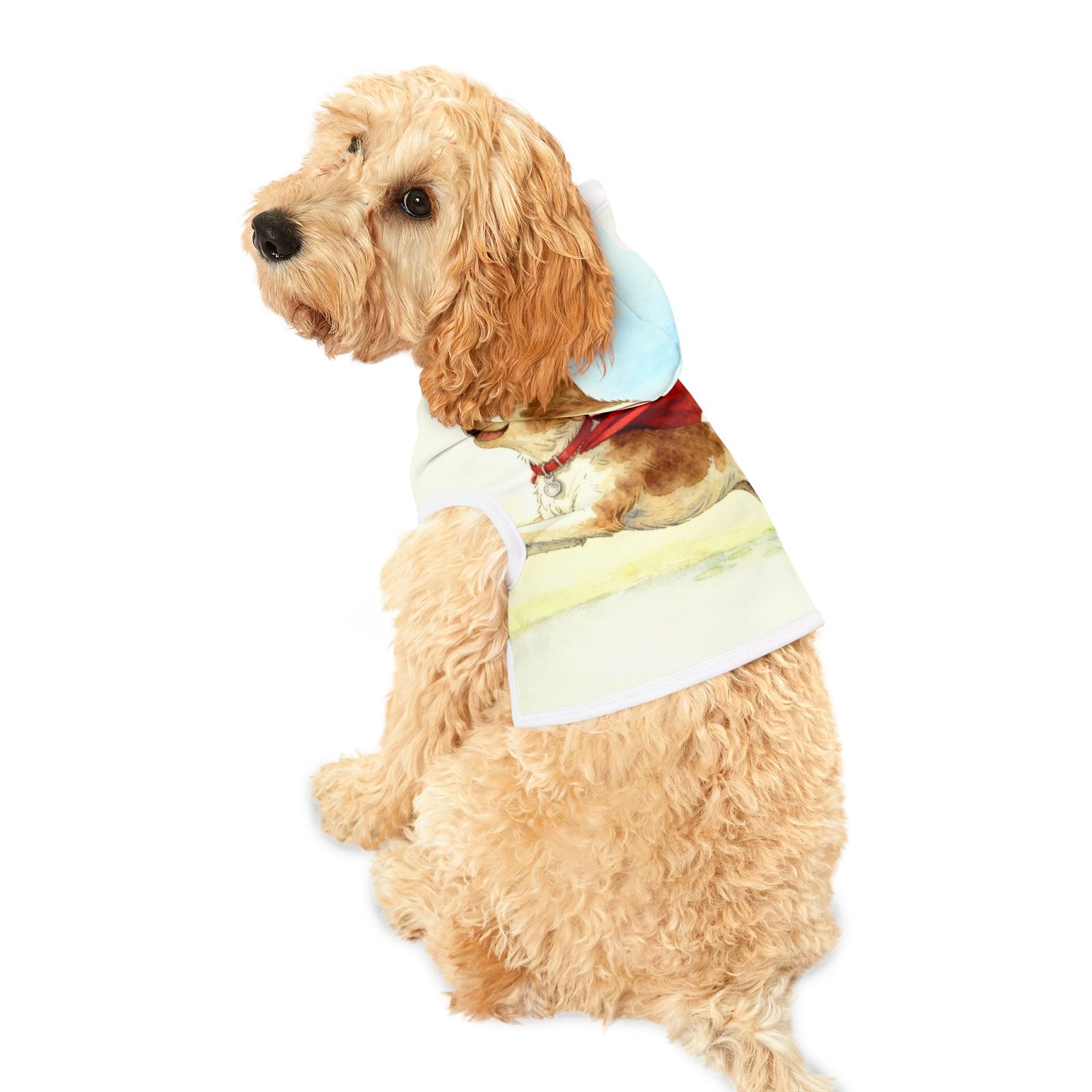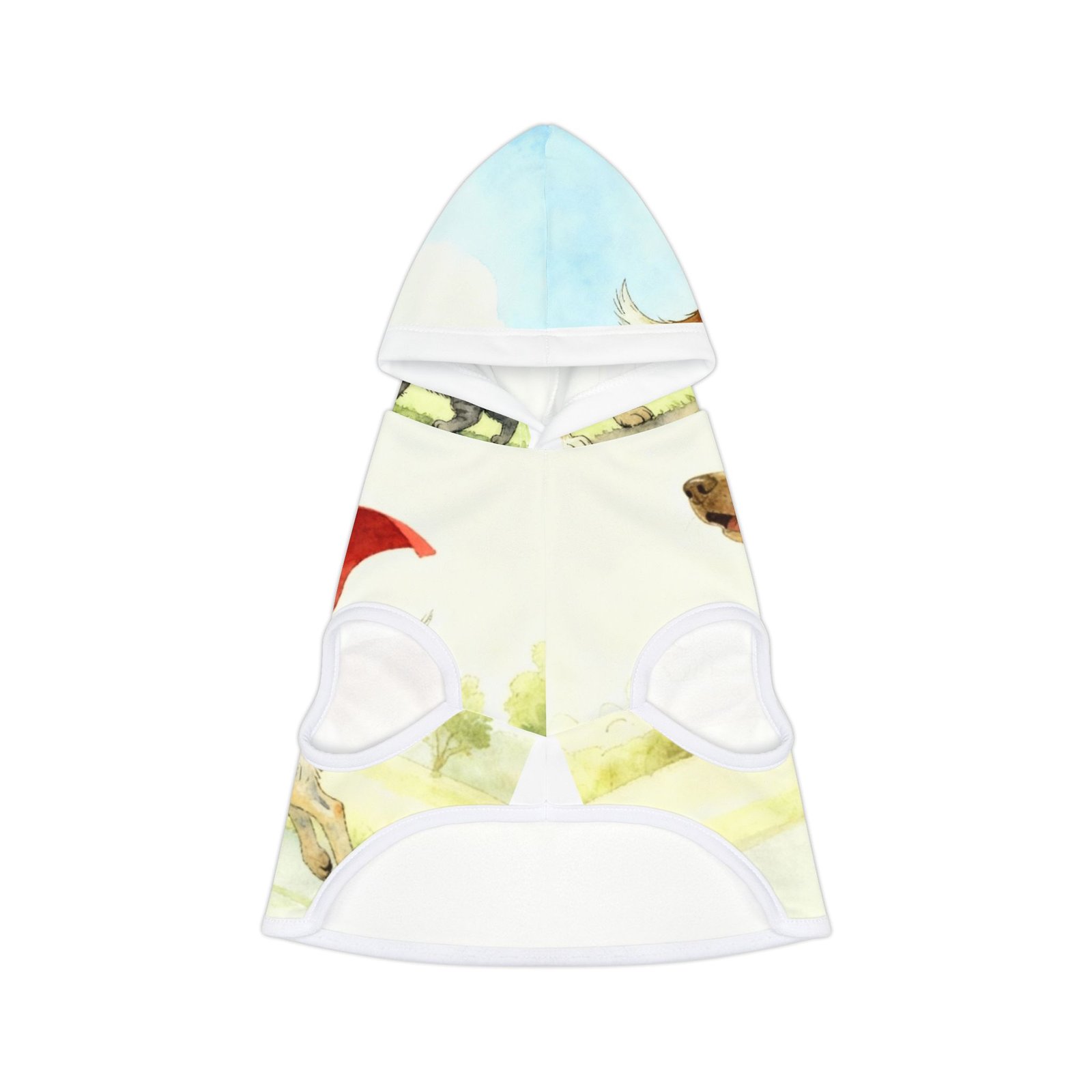 Lightweight, soft, and made for playful afternoons — this pet hoodie brings a warm, whimsical touch to walks and couch cuddles. The watercolor-style print shows a joyful dog sprinting with a tiny red cape, evoking motion, mischief, and pure pet-energy. The fitted hood and well-placed arm openings keep your companion cozy without restricting movement. Choose a black or white rib to match the print’s accents, and pick from seven sizes so the fit feels thoughtful and tailored. Assembled in the USA from globally sourced parts, the hoodie holds its shape and dries quickly thanks to the durable 100% polyester fabric. It’s a little costume, a lot of comfort — for pets who love to be seen and adored.